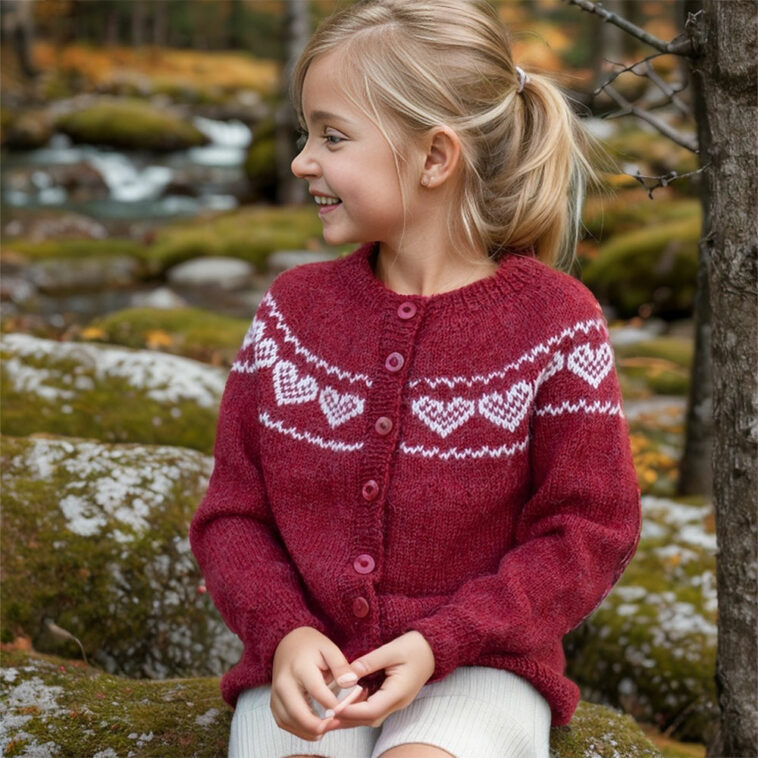 Gratis strikkeoppskrift på Hjertejakken med rundfelling til barn, en sjarmerende og hjertevarm jakke perfekt for små eventyrere.