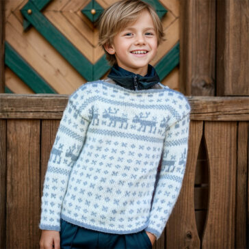 Gratis strikkeoppskrift på Laila strikkegenser med rein til barn, en varm og sjarmerende genser som passer perfekt for aktive vinterdager.