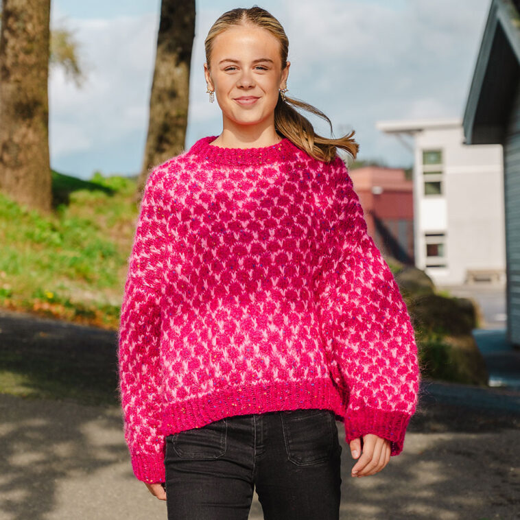 Gratis strikkeoppskrift på Bumble genser, en moderne og oversized genser med en spennende tekstur og lekent mønster, perfekt til både hverdags og vinterkos.
