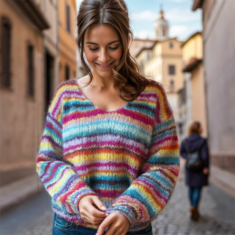 Denne unike genseren strikkes i Flamingo fra Belfilato, en garnblanding som består av 73 % mohair, 22 % ull og 5 % polyamid. Genseren strikkes i en fargerik palett bestående av gul, lys lavendel, rose, lys gul, bordeaux, turkis, mintgrønn, aqua grønn, pink og oransje. Dette gir et livlig og friskt utseende som lyser opp enhver garderobe. Du kan selvfølgelig velge farger selv for å tilpasse genseren til din egen stil.