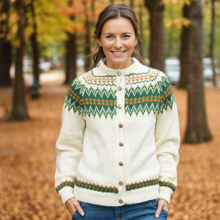 Gratis strikkeoppskrift på Maudalkofte med raglanfelling, en tidløs og elegant kofte som kombinerer klassisk norsk mønster med spreke farger.