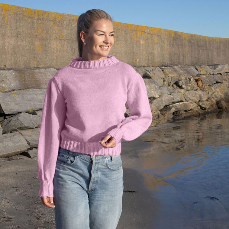 Denne genseren strikkes i Sportsull fra Den Lille Garnfabrikken eller Sterk fra Du Store Alpakka. Sportsull gir slitestyrke og varme, mens Sterk tilfører mykhet og fleksibilitet med sin blanding av alpakka, merinoull og nylon. Genseren strikkes i en pudderrosa farge, men du kan selvsagt velge andre farger for å gjøre genseren personlig.