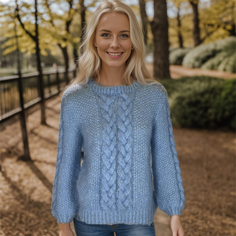 Denne genseren strikkes i Flamingo fra Belfilato, en garnblanding av 73 % mohair, 22 % ull og 5 % polyamid. Genseren strikkes i den nydelige fargen isblå, som gir et friskt og moderne uttrykk. Du kan selvfølgelig velge egne farger for å tilpasse genseren etter din stil.