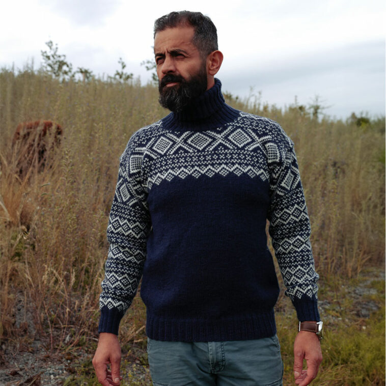 Gratis strikkeoppskrift på Cortinagenser med høy hals, en tidløs klassiker som kombinerer tradisjonell norsk mønsterstrikk med moderne komfort og varme.