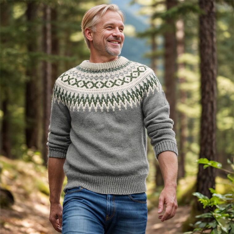 Gratis strikkeoppskrift på Rallargenser, en slitesterk og varm genser, perfekt for både hverdag og utendørsaktiviteter.